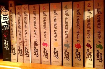 Illetve az írónőnk lefotózta a polcát, ahol az SZJG összes kötete, a Kalauz, majd a Bábel sorakozik fel :) Jól mutatnak, nem? :)